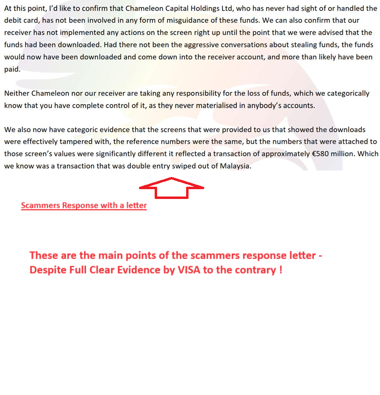 | 27 | Chameleon Capital Holdings Ltd With Prosperity & Associates Business Consulting | Chameleon Capital Holdings Ltd / Prosperity & Associates Business Consulting | USA Texas(Prosperity) / UK London (Chameleon Capital Holdings ) | Money Transfer | POS | Approved | Chronology of relevant events:  1. Investment Agreement signed 20 November 2023 between J. Card Holder and Chameleon Capital Holdings Ltd represented by Mr Andrew Louis Howard Needleman (attached below).  2. Invitation received by me, Mr J. Card Holder , from Mr Needleman, to travel from my location in Dubai to Houston, Texas, to visit the offices of Prosperity & Associates Business Consulting Services LLC, to meet Mr Robert Reyes. I was led to believe that Mr Reyes was the Compliance Officer for Chameleon Ltd and that I was to provide him with my Visa debit card for downloading.  3. Meeting at the offices of Mr Reyes located at 5100 Westheimer Road, Suite 420, Houston TX 77056, United States, December 2023, at which Mr Reyes was provided with my Visa debit card (photo below).  4. On 6 December 2023, with contracts signed, the necessary transaction codes were provided to Chameleon Ltd by Mr E. Mandate to Sender and his associates. 5. €10,000,000,000.00 (Ten Billion Euros) was successfully downloaded from the card. In addition to Mr Andrew Louis Howard Needleman, two other individuals within the Chameleon Capital Holdings Ltd group were involved in this transaction, and are willing to assist in the fund’s recovery: • Mr Mark Hodges – Phone +1 (651) 417-XXXX • Mr Paul Kanes – Phone +44 7753 XXXXXX  Page 1 of 52 The following information is provided as appendices to support this authorization: • Appendix 1 – Black download screen dated 6 December 2023 showing transaction amount €10,000,000,000.00 (Ten Billion Euros). • Appendix 2 – Black and Blue screens dated 7 December 2023 showing zero balance after download. • Appendix 3 – A photograph of Mr Robert Reyes together with myself at his office in Houston, Texas, receiving my Wells Fargo Visa debit card. • Appendix 4 - Investment Agreement dated 20 November 2023 between myself J. Card Holder, and Chameleon Capital Holdings Ltd. (Below) • Appendix 5 - Prosperity & Associates Business Consulting Services LLC company information provided by the office of the Texas Secretary of State. • Appendix 6 – POS Card Loading Agreement signed 30 January 2023. • Appendix 7 – Corporate Project Agreement dated 12 November 2023 between Chameleon Capital Holdings Ltd and M.r J Card Holder / Follow Me Global Business Solutions LLC • Appendix 8 – CIS of Prosperity & Associates Business Consulting Services LLC AFTER SCAMMER RESPONSE: The scammers came up with ridiculous excuses that they have never downloaded the funds which they had, and we supplied them the VISA proofs. They claim some additional codes needed which is 100% false, and then they claim it was downloaded by someone else they do not know about. Full of lies and ridiculous excuses Our response: We have received your response dated December 13, 2023,  However we dispute the claims and assertions you have made in this letter which are 100% false. We know and will prove in a court of law in the UK/USA you have successfully downloaded these funds and leverage those funds without fulfilling your contractual obligations. We also plan to sue your additional assistants to the download including mr. David Reyes and his Company: Prosperity & Associates Business Consulting Services LLC. We have all the proof your company with Assurances of Mr. Reyes Have Download the funds and have used our funds portion to trade our funds. We are giving you here last chance to pay our share of  37.5%  of 10 Billion or  3,750,000,000  Euro (Three Billion and Seven Hundreds and Fifty Million Euro) as we have been  instructed by Mr J Holder to hold all recovery Funds for us and the card holder and sender side intermediaries. If we do not receive the payment by 3/15/2024 , we will instruct our attorney to file the legal proceeding against you and your company. If we do not receive the payment by 3/22/2024 , our top attorney firm we have hired in the USA and UK will initiate legal proceedings against your company and its associates. Just be advised we will not only seek the funds you have downloaded successfully owed to us , but in addition will seek any leveraging profits you have used in using our funds for trade/credit lines/Etc. . Furthermore, we will seek all legal costs reimbursement in UK and USA. Case in litigation and Recovery as of May 2024 Watch these Scammer companies: Prosperity & Associates Business Consulting Services LLC. and David Reyes and and Chameleon Capital Holdings Ltd Represented by: Mr Andrew Louis Howard Needleman. Both work together. Scammers Be Aware - do not give the 2 companies above any POS project funding files !  you will lose and never be paid .. | See attached | Pending |