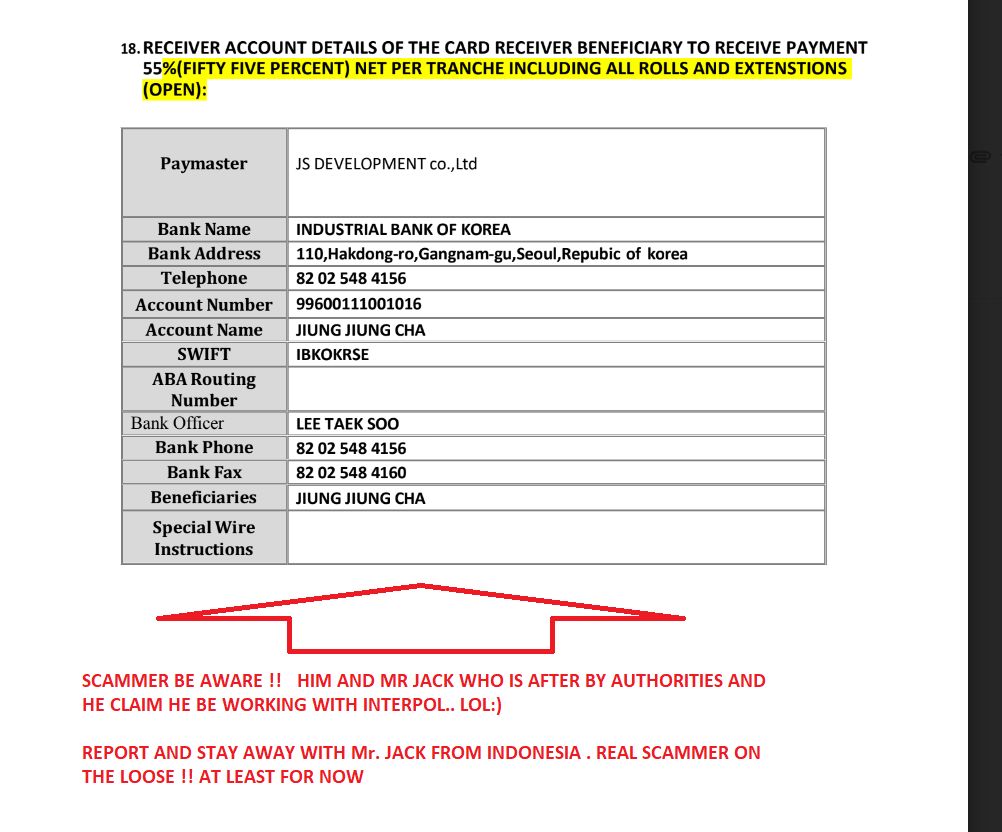 | 18 | HWANG MYUNG HWA (Receiver) / CO. Conspirator : Mr. Jack SATOSHI from Indonesia (His POS Operator) | JS Development LTD | Korea & Indonesia ( Operator) | Money Transfer | POS | Approved | This scammer and his Operator from Indonesia can successfully download digital funds But, they never pay and will steal the funds from their "new banks" and always under a new scheme. Stay away! Report to anyone who might do business w them. Mr. Jack the Operator is a con man with no remorse .. Stay Away so you wont lose any money w them | See above Ask for more info we will be happy to provide more proofs | Pending |